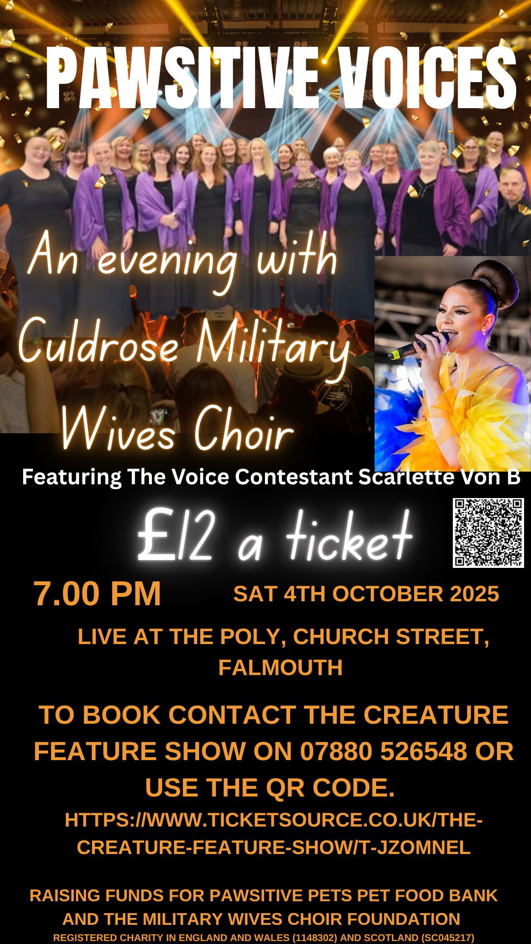 We are welcoming Culdrose Military Wives Choir and Scarlette Von B. For an evening of singing while raising funds for Pawsitive Pets Pet Food Bank and The Military Wives Choir foundation. Come along and support two amazing charities.